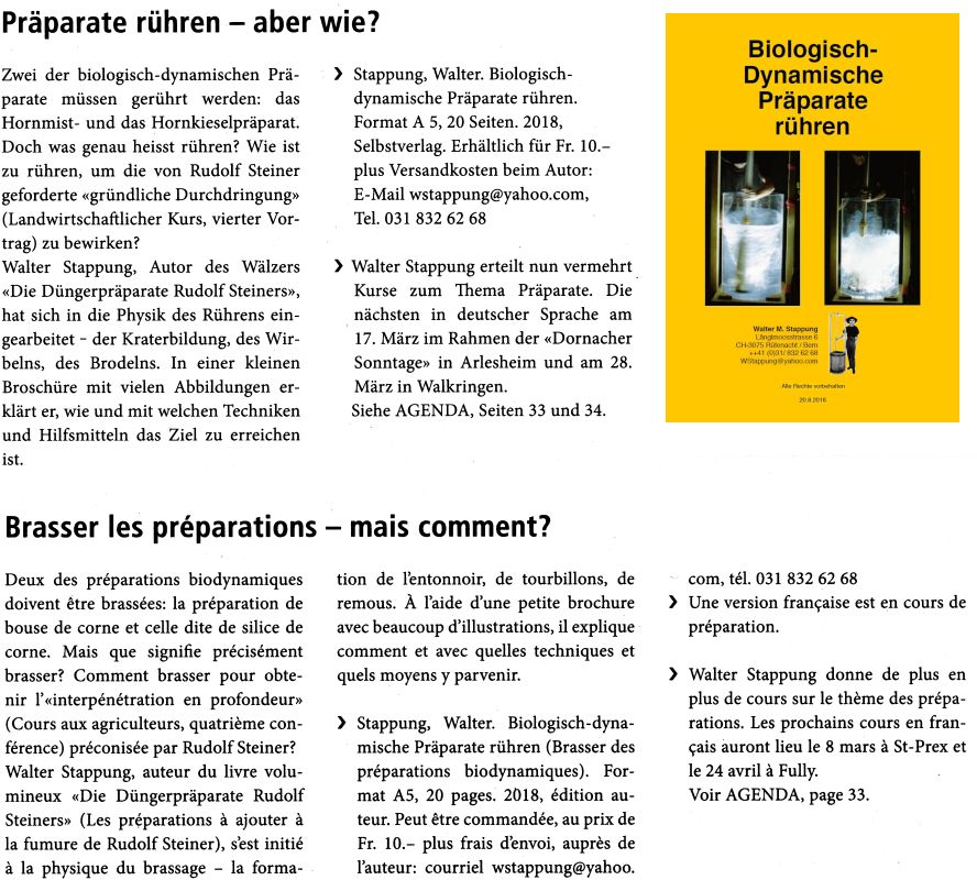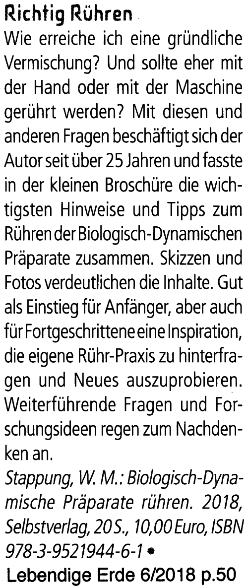 Biologisch-Dynamische Präparate rühren Walter Stappung, CH-Rüfenacht 2018 ISBN 978-3-9521944-6-1 („Rührbroschüre“)